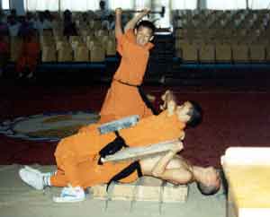 Psychological qi gong: I now digress, and get out of the physical framework of my categorization of qi gong, and move into some of what I call, "other forms" of qi gong; or, more specifically, reasons and explanations for what people think is qi gong. And just when you thought you had my whole thought process on this qi gong stuff down pat. Picture this if you will: the images of monks being beaten about the head with stone blocks, others lying on a bed of nails as another monk crashes down a sledge hammer on a stone atop his abdomen, another monk twirling around on top of a spear, or leaning against a spear lodged firmly against the soft part of his neck. Explain that with qi gong. How does the movement of qi to these areas of the body explain the lack of injury? Well, one of the things I mentioned years ago, and still believe, is the power of the placebo effect. The placebo effect is basically this: If you take two groups of people with similar diseases (let's use headaches, which unfortunately, I am no stranger to), and give one unknowing group aspirin, the other unknowing group sugar pills, and lead them all to believe that they're getting aspirin, an inordinately large amount of the people receiving the sugar pills will claim to get pain relief. Leading someone to believe that they will derive a certain benefit from something, can sometimes cause that person to derive that benefit. (The opposite is true also, people can "think" themselves into certain types of illnesses, what we call "malingering", or the "Munchausen Syndrome") No doubt, after years of practicing qi gong, the monks are going to derive a certain amount of placebo effect from it. How much this plays a part in their so called resistance to pain from various activities, I do not know.