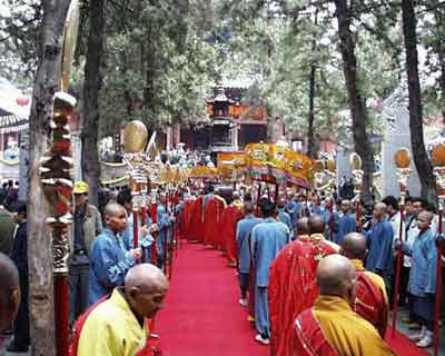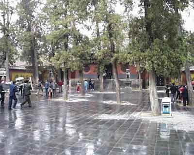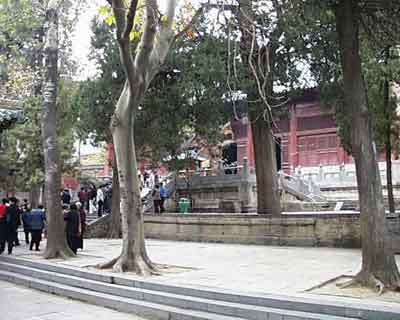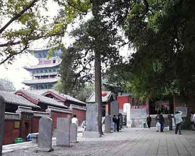After the founding of the new China, the government allocated large sums of funds to restore the monastery. Now the halls, pavilions and corridors have regained their former grandeur. Above the front gate hangs a sign in 'Emperor Kang Xi's handwriting: "Shaolin Monastery." In front of the entrance gate is a pair of stone lions. Entering the gate, one sees two rows of stone tablets, which are various dedications to the Shaolin Temple from various organizations around the world. In the second, third, and fourth courtyards are the Heavenly King Hall, the Daxiong Hall and the scripture depository. The abbot's room is in the fifth courtyard. Emperor Qian Long stayed a night there when he came to visit Mt. Song, thus the room is also called "Dragon Hall. " There is a pavilion that has a story: Monk Hui Ke stood deep in the snow outside the cave in which monk Boddidharma sat in deep meditation. the young monk pleaded to be taken as the sage's disciple. The old monk said, "Not until the Heaven makes the snow red." Monk Hui Ke cut off one of his arms and the blood dyed the snow red. Needless to say, Boddidharma took him as a disciple. Later he succeeded monk Boddidharma as the abbot. This pavilion was built to commemorate his devotion. This story is also the reason why Shaolin monks bow with only one hand elevated in front of them, as opposed to the usual "praying hands" posture other monks use.