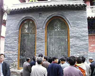 In the seventh courtyard there is the Hall of One Thousand Buddha's. In the old days, monks practiced martial arts here. Long years of practicing in a squatting position caused the monks' feet to rub 48 pairs of footprints in the brick floor. A mural describes five hundred Luohan Buddha's paying homage to Buddha. East of the Hall of One Thousand Buddha's is the White-Garment Hall, also known as the Hall of Wushu Charts. In it are two murals, one describing the thirteen monks rescuing Prince Qin and the other showing monks drilling.