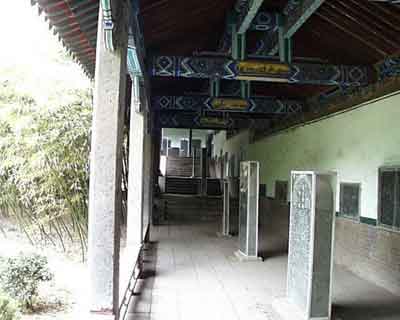 Flanking each hall are the wing houses. Along both sides of the Stone Tablet Forest a covered corridor was recently built to house the more important stone inscriptions on the east and a boxing chart hall on the west in which 14 groups of 215 life-size clay figures demonstrate Shaolin Wushu and legends of monks.