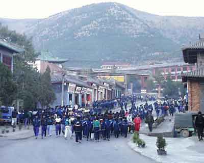 So the monks split along two lines. The martial monks, those who had decided to devote their lives to the training and perpetuation of wushu, left the Temple and lived in the nearby wushu guan, to teach, and train, younger students. The wushu guan was a school, not a repository for monks to be. Students were trained in Buddhism, along with English, Chinese, and mathematics. Those who showed exceptional skill were offered the monk hood at the age of 18; then, further training was undertaken. At that time, they had the opportunity to live in the Temple, and continue training there, under the tutelage of one of the remaining Temple wushu masters, but only to train and live in the far rear areas of the Temple complex, far from the maddening tourism. The Buddhist monks (a misnomer, as they are all Buddhist monks), largely stayed at the Temple. In reality, they really had no where else to go. No longer did they have to undertake the daily chores of cleaning and repairing the Temple, now, due to government intervention, workmen and janitors take care of those duties. The Buddhist monks stay at the Temple to study, and to entertain visitors. They may have partaken in wushu studies years ago, but do so no longer. There are a few monks who live at the Temple and who continue to practice wushu on a daily basis, and who also take in new monks, largely hand picked from various other schools if they show "promise" to be a wushu master. These few monks continue the training and the heritage of the Shaolin Temple, as we have commonly been led to believe.