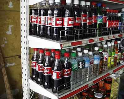 The supermarkets here are small compared to ours back in the US. Actually, they're tiny compared to ours in the US. Most of them are single little storefronts, bigger than the ones in Shaolin (and don't double as the family's living quarters), but not any larger than, well, I can't really think of anything to compare it with back in the US, because, we really don't have any stores this small back home. Figure about fifteen feet wide and ten feet deep. That's about the typical size. Inside them are the usual, same stuff that you see in every other Chinese food store. You get the occasional American products, and then you get the typical Chinese imitation. Water is for sale in little 600 ml bottles. And Coke is king here. You won't find a Pepsi product. Coca Cola must have pulled some smooth moves years ago with the right people. It's all over the place.