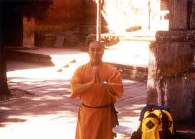 The ceremony was quite the thing. I really hadn't expected what had happened. I was told through a translator friend, Mr. Guo, that Shi De Cheng was going to come to the training center with a few monks, do the ceremony, recite some words, and about ten minutes later, it would be all over. He told me that I would become a "custom monk", a "su jia dit zi", which in Chinese means something like a "common man". They use the term for Shaolin Temple monks who leave the monastery to marry or to teach gong fu in a private life. "It will be a simple ceremony". So, I figured, no sweat, this was going to be easy. Say the words, get it over with, and start teaching me the good stuff. When the day came, which happened to be the day prior to my leaving, I washed in the usual cold water (fortunately the pump was working that day), got out a pair of unused clean white pants that I was saving for a "special occasion" (like a date with some Chinese babe.... HA! God they were terrified of me....), and went down to the training center to wait for Shi De Cheng. He showed up at the appropriate time, but to my surprise, he showed up alone. I had thought that this was going to be easier than I had originally expected. That was when he gestured to me that we needed to go to the Shaolin Temple. The ceremony would take place there. OK, I figured, we'll find a back room some where, do the chants, and be done with it. But deep down, my anticipation level was starting to rise. Along with a little bit of fear and uncertainty.