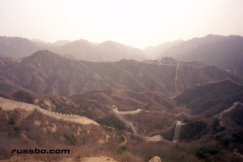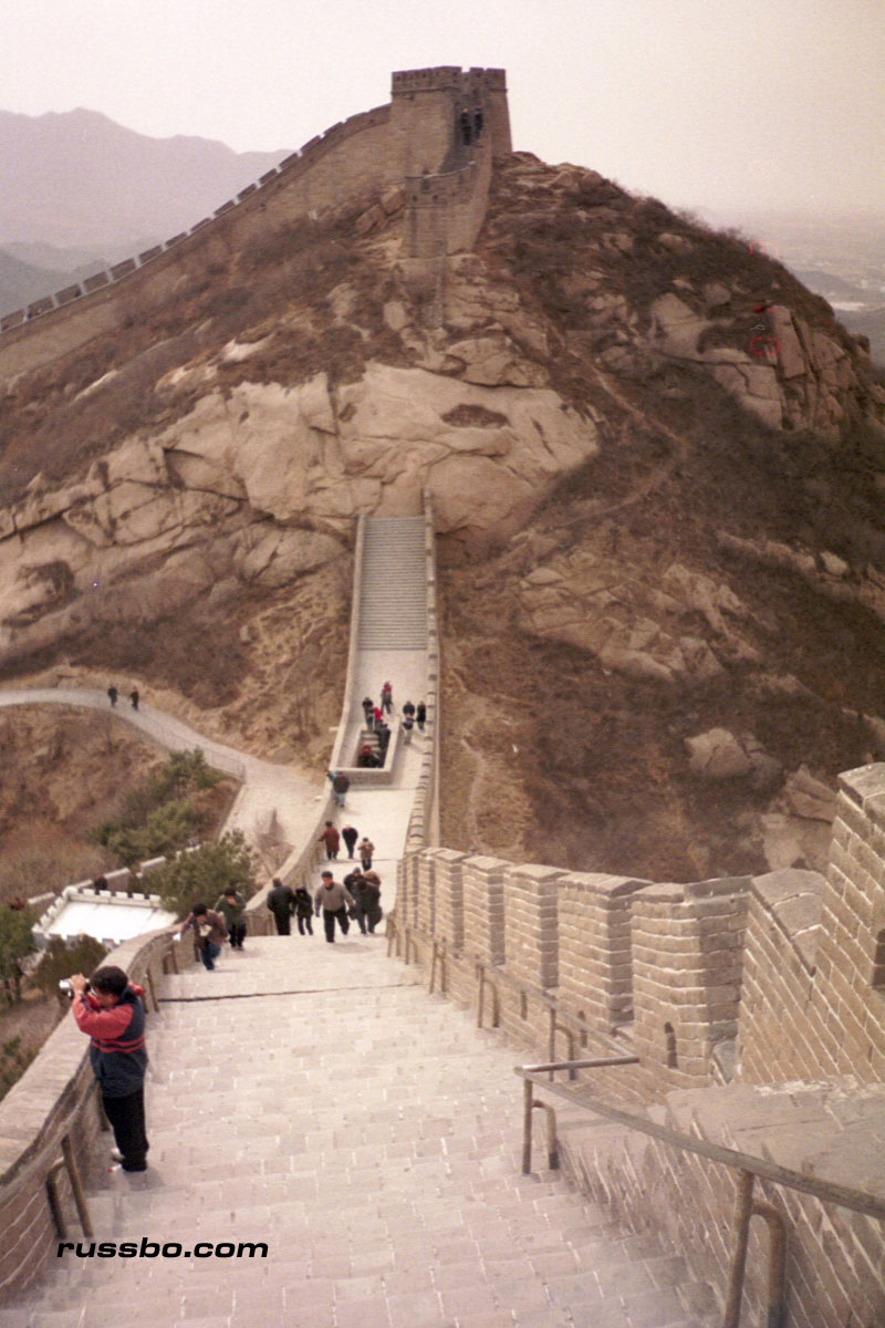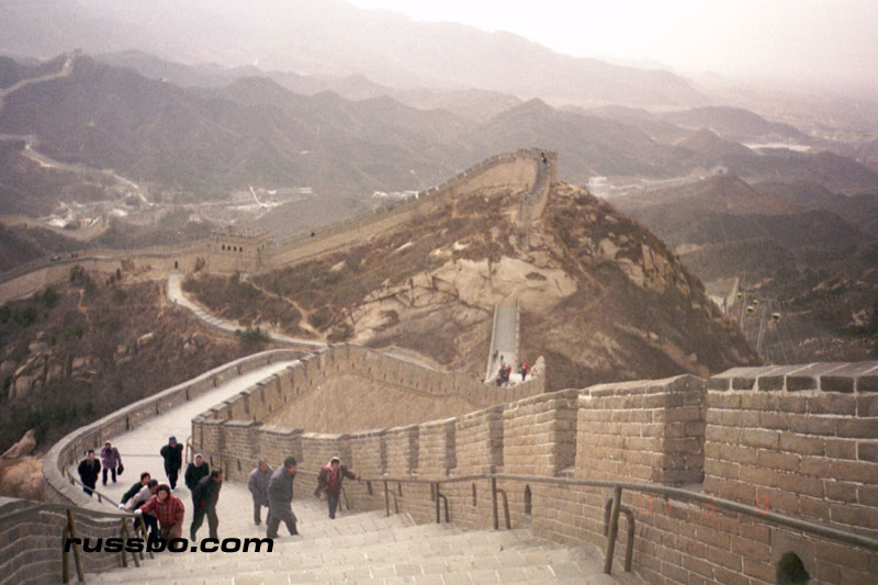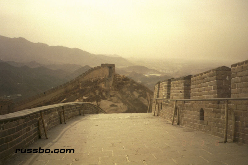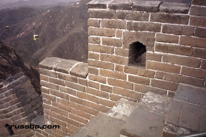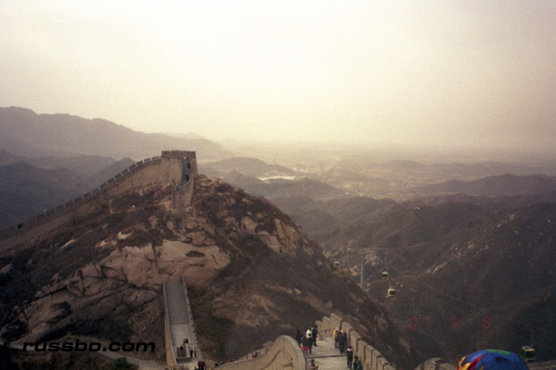 The Great Wall at Ba Da Ling is nearest to Beijing, and is therefore one of the most frequented spots visited by tourists. It is also one of the most spectacular, not because of the nearby surrounding countryside, or, the remoteness of it, but because from the higher sections of Ba Da Ling, one can view many various sections of the Wall as it travels up mountainsides and down into valleys. There are many sections of the wall that one can see from the higher vantage points. Viewing Ba Da Ling from the lower sections, which is most frequented by tourists, does not yield the stunning vistas that one sees from higher up. The view from the higher sections can be attained by walking up the Wall pathways, but, the more time and energy efficient method is to take the cable car, which, considering the high winds in the area, is an adventure in and of itself.