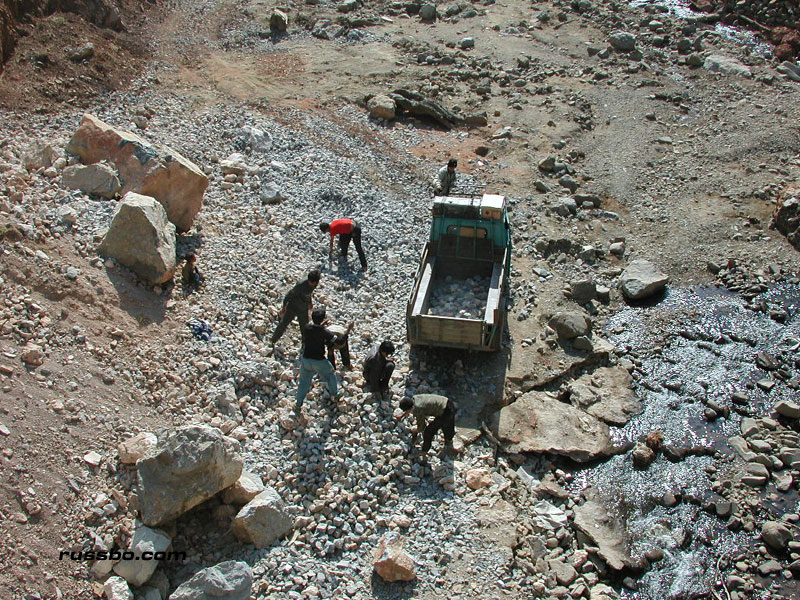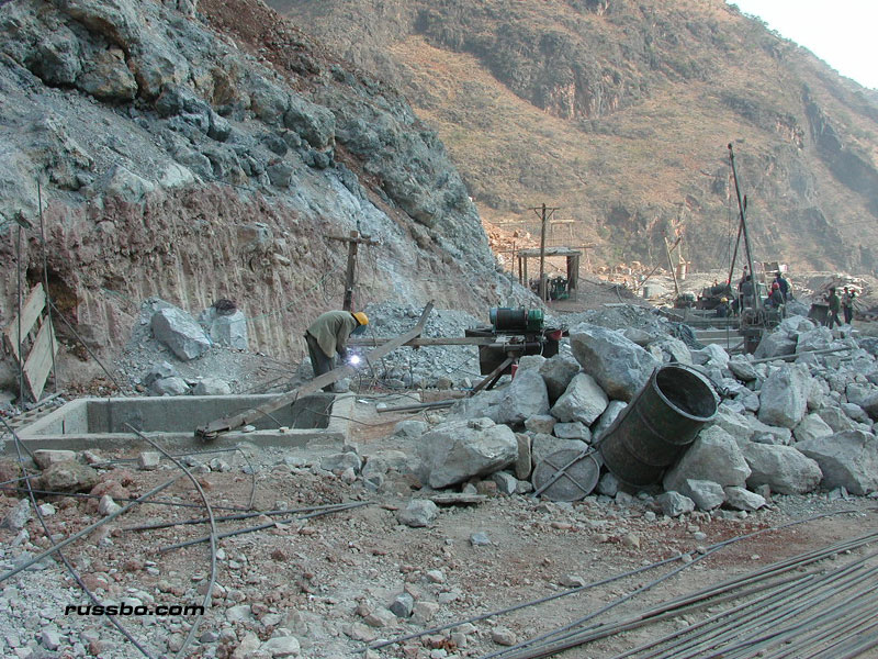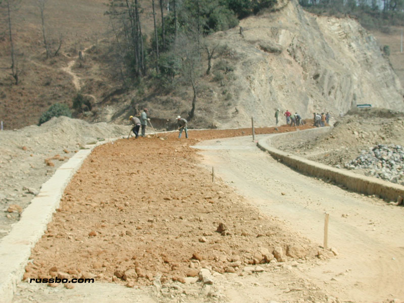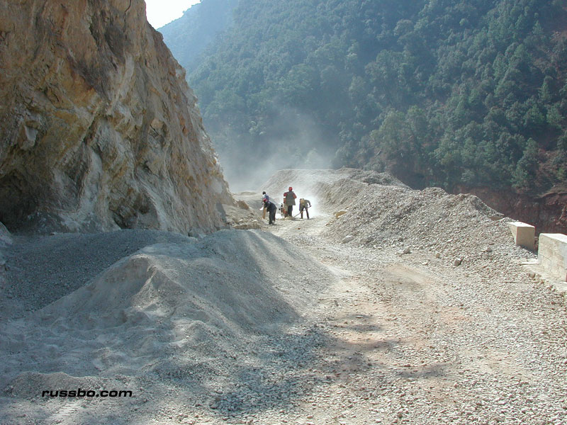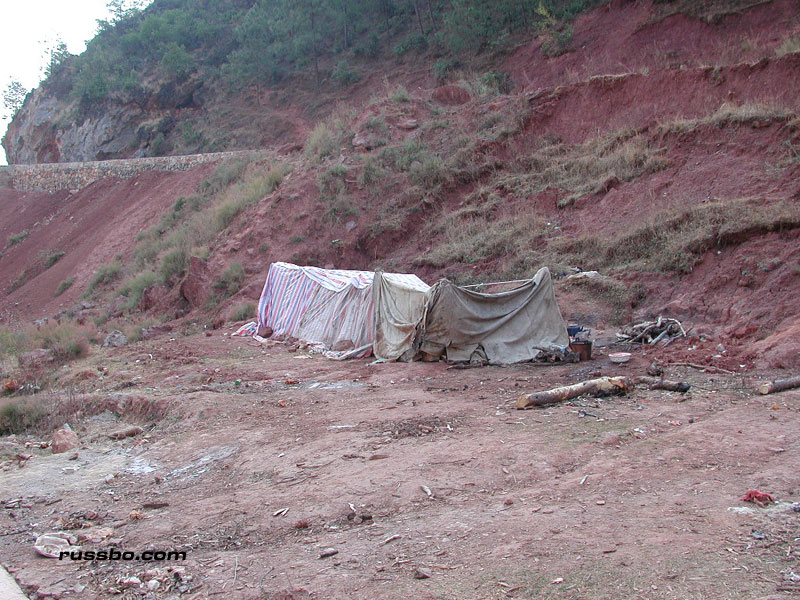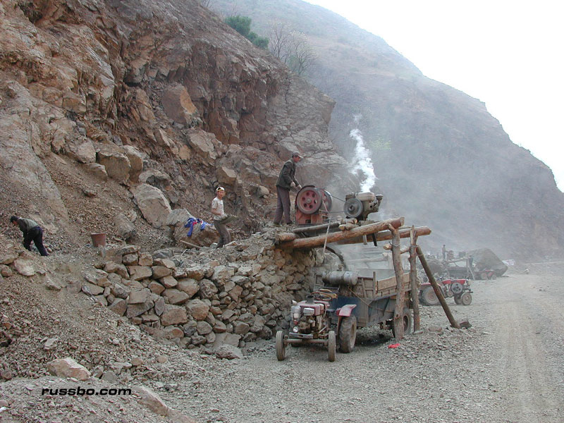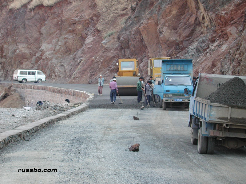 Yes, the overlay of tar. The only thing that's done by heavy machinery. Everything else is done by hand. Chinese hands. Hands that live on the side of the road, hands that eat food and water that's brought by transport. Hands that live in small canvas covered creations. Hands that live there during the entire one to three year construction period. Working every day, from sun up to sun down.