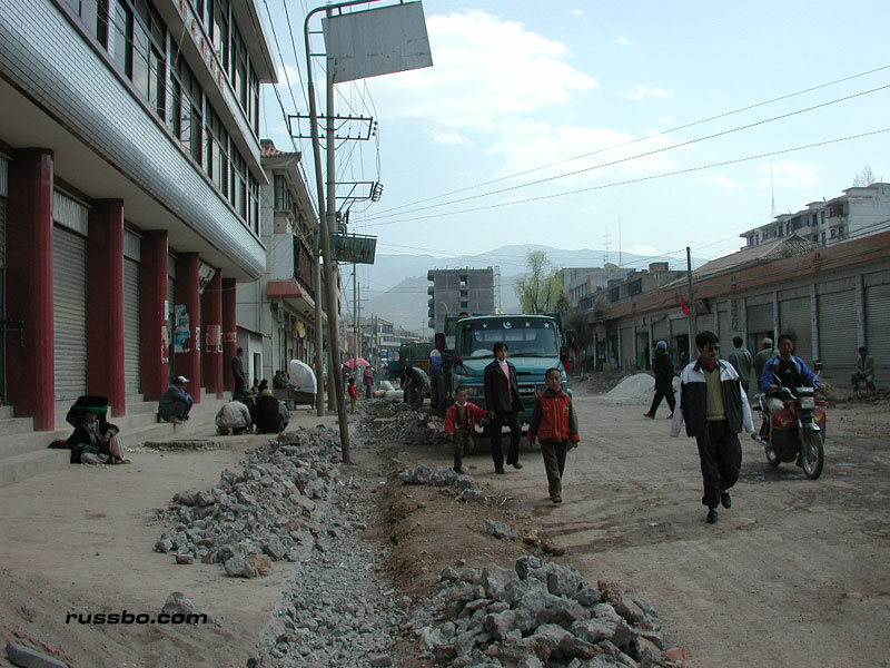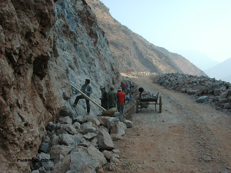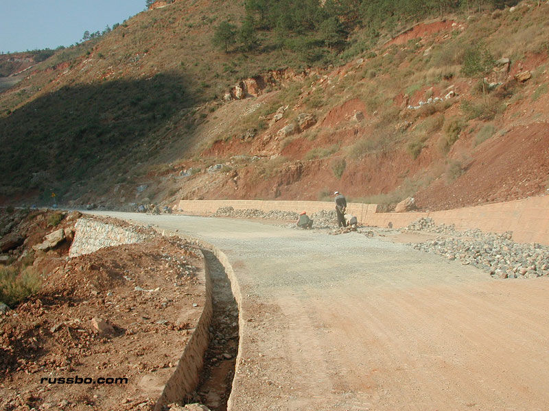 One can see all aspects of typical Chinese road building traveling to Lu Gu Hu. The initial destruction of hillsides. The manipulation and destruction of large boulders. The creation of small side walls. The smoothing and leveling of the roadway bed. The cutting and fitting of stones into small interlocking pieces. The covering of said stones with finer gravel. And, eventually, the overlay of tar.